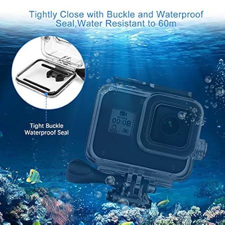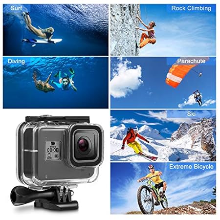 Wasser- und Sturzsicher: Aus einer hochfesten Schale, mit fester Schnalle und wasserdichter Dichtung, kann die wasserdichte HĂŒlle bis zu 60M aushalten. SchĂŒtzen Sie Ihre GoPro Hero 8 Action Kamera in Extremsportarten wie Surfen, Tauchen, Schnorcheln, Skifahren, Driften, Fallschirmspringen usw.